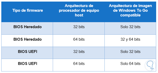 También debemos tener en cuenta la compatibilidad entre el equipo host y Windows To Go según se indica en la siguiente tabla: