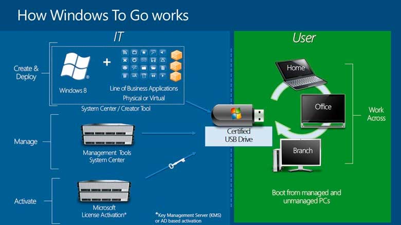 Existen determinadas diferencias entre estos dos tipos de instalación. En la imagen de Microsoft podemos ver un esquema de cómo funciona Windows To Go.