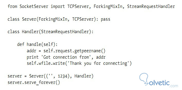 Lo primero que hacemos es importar los módulos que necesitamos de SocketServer, importante que nos fijemos es en ForkingMixIn que es quien se encargará de gestionar la duplicación de los procesos con cada petición, luego definimos la clase Server y Handler, dentro de Handler colocamos un constructor, que es quien va a gestionar que pasará con las conexiones entrantes, en este caso, obtendrá el nombre del cliente y hará una impresión por pantalla de un mensaje; por ultimo instanciamos la clase Server, le pasamos los parámetros, primero el puerto donde aceptara conexiones y luego la clase Handler, finalmente llamamos el método serve_forever para iniciar el servidor y que pueda gestionar las peticiones de los clientes.