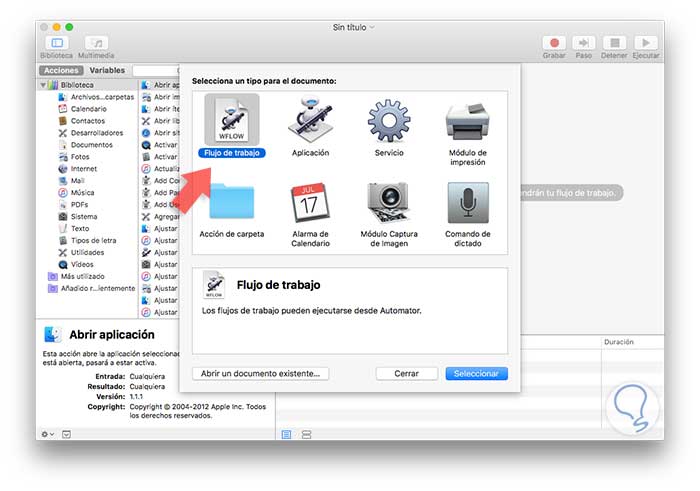 Seleccionamos la opción Flujo de trabajo y en la parte inferior pulsamos en el botón Seleccionar. Recordemos que un flujo de trabajo se activa en Automator y es ejecutado con la aplicación abierta o también podemos crear aplicaciones para ser ejecutadas fuera de Automator.