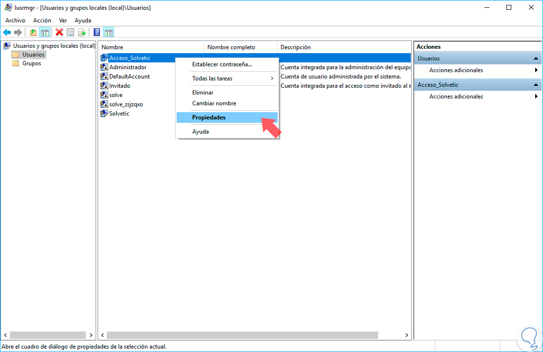 Pulsamos Enter o Aceptar y veremos lo siguiente donde debemos pulsar en la carpeta Usuarios y dar clic derecho / Propiedades o doble clic sobre el usuario que no podrá llevar a cabo el proceso de cambio de contraseña: