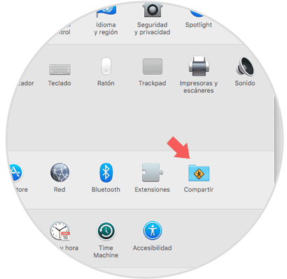 El siguiente paso consiste en habilitar los archivos compartidos, definir las carpetas y el usuario que hemos creado con sus respectivos permisos. Para esto vamos de nuevo a Preferencias del sistema y allí seleccionamos la opción Compartir: