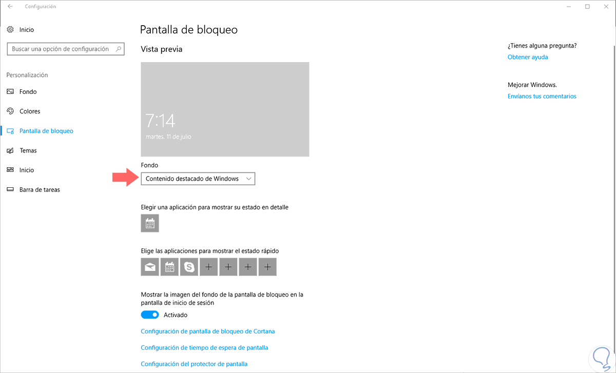 Para ello debemos ir nuevamente a Configuración / Personalización y allí seleccionaremos la opción Pantalla de bloqueo y en la sección Fondo estableceremos el valor Contenido destacado de Windows: