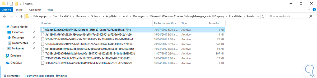 Windows 10 nos ofrece de forma predeterminada numerosas opciones de edición, personalización y configuración del sistema y una de estas está relacionada con las imágenes que son desplegadas en la pantalla de bloqueo de Windows 10 las cuales podemos personalizar ya que la ruta donde estas imágenes son almacenadas es la siguiente. Allí debemos cambiar las extensiones a JPEG para que los cambios tomen efecto.
