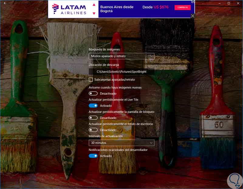 Esta ruta podrá ser modificada pulsando en el botón Ajustes. Con esta aplicación serán descargadas imágenes en resoluciones de 1920×1080 y 1080×1920.
