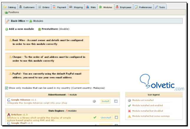 También podemos incorporar nuevos módulos o elegir los que ya estén previamente instalados y que este disponibles en la tienda realizada con PrestaShop.