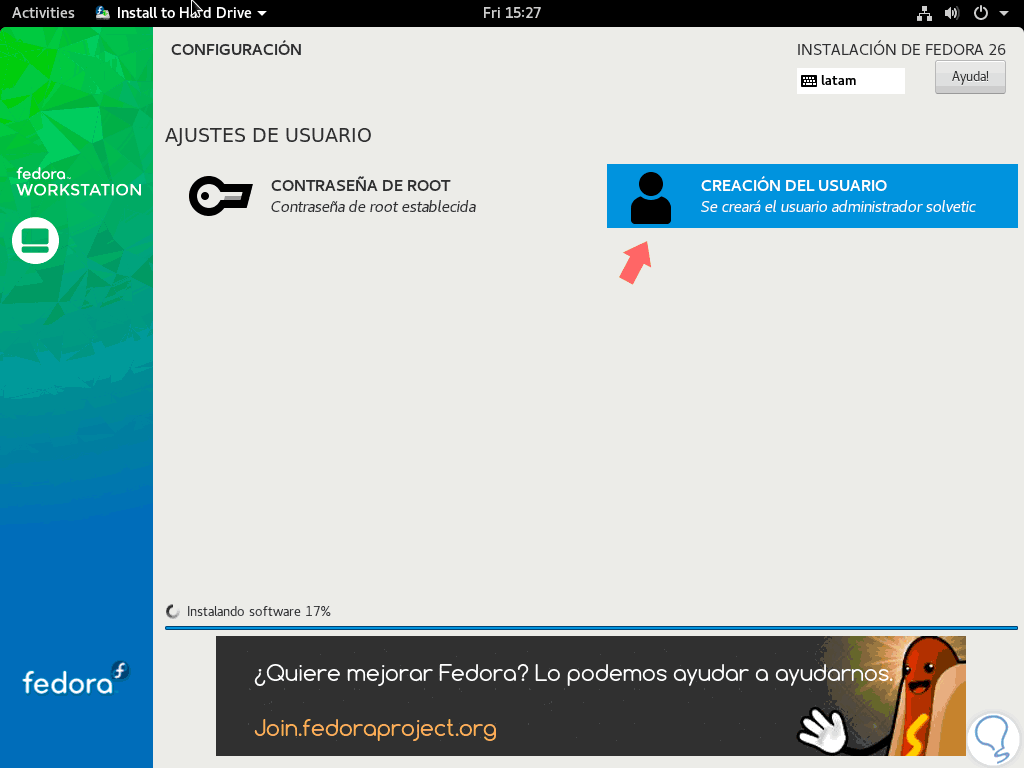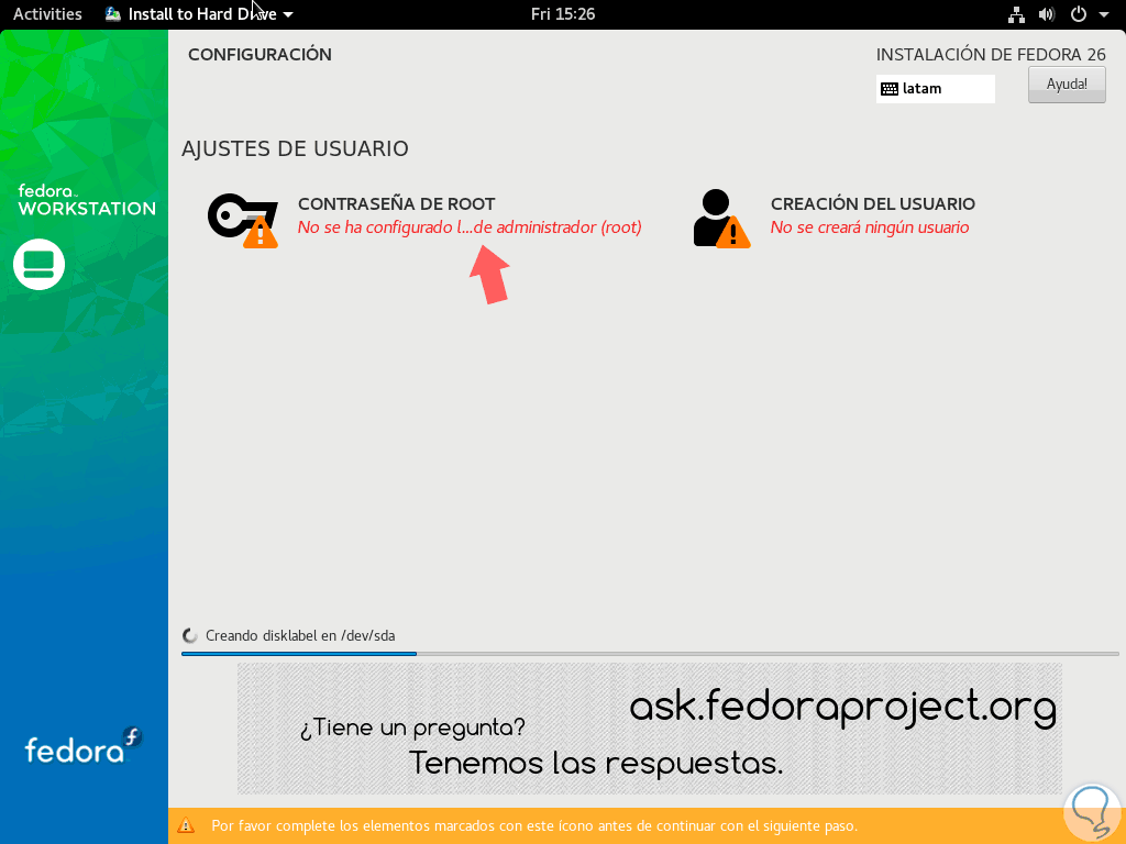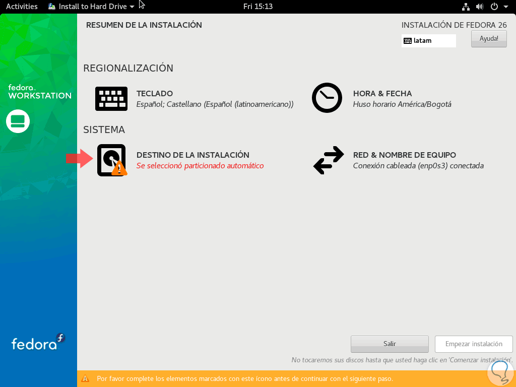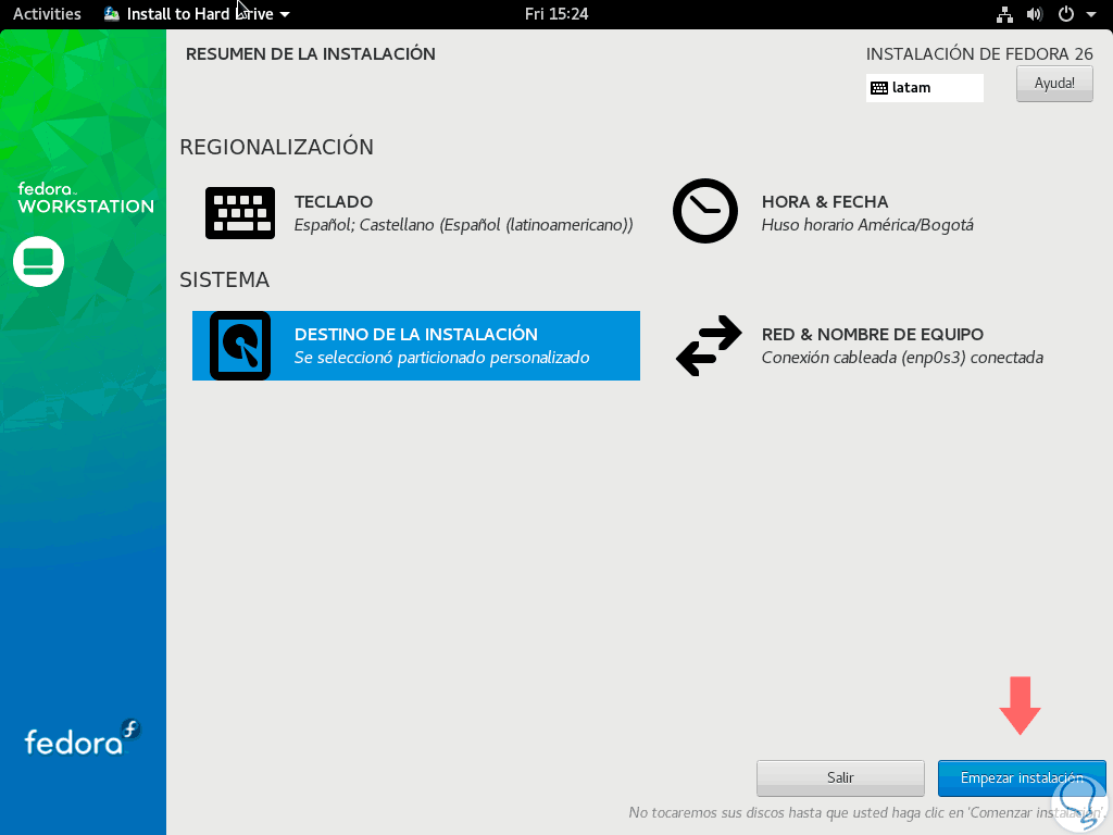 Pulsamos en el botón Empezar instalación para comenzar el proceso de instalación de Fedora 26 y veremos la siguiente ventana:
