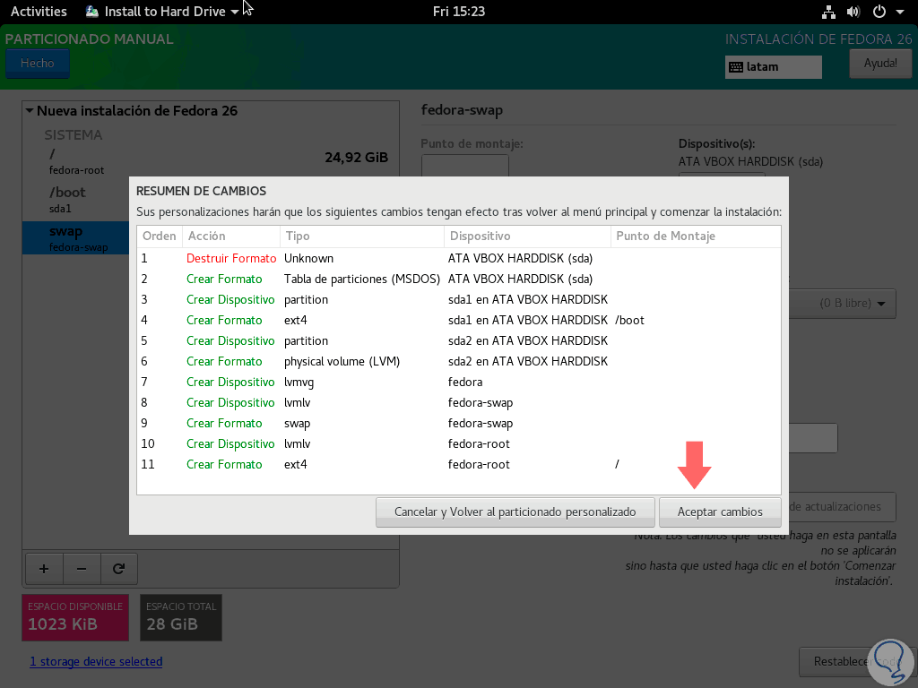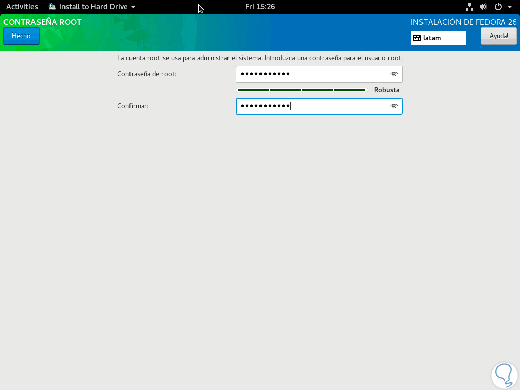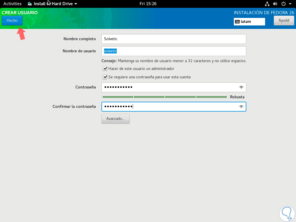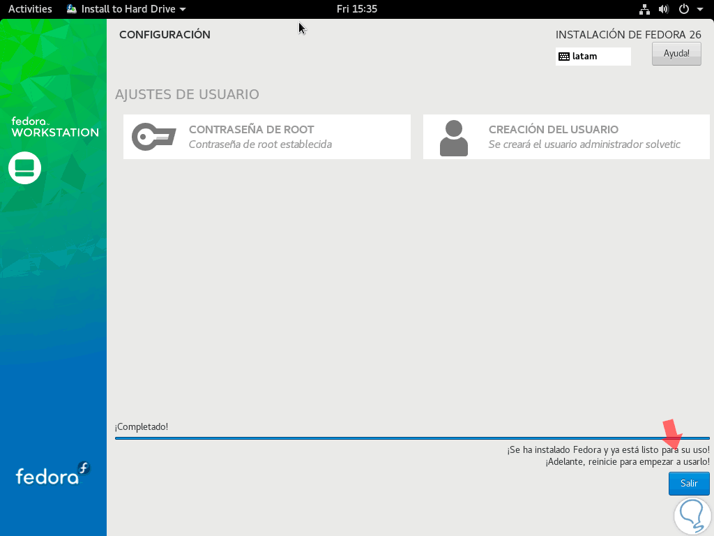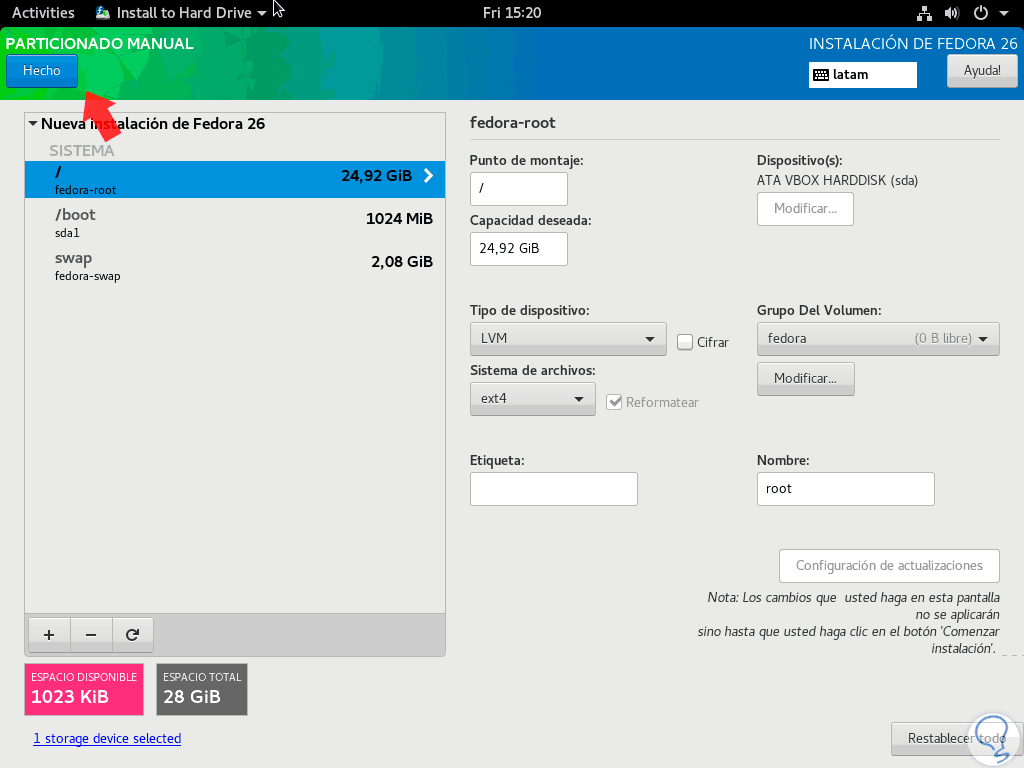 Pulsamos en Hecho y continuara el proceso de instalación de Fedora 26: