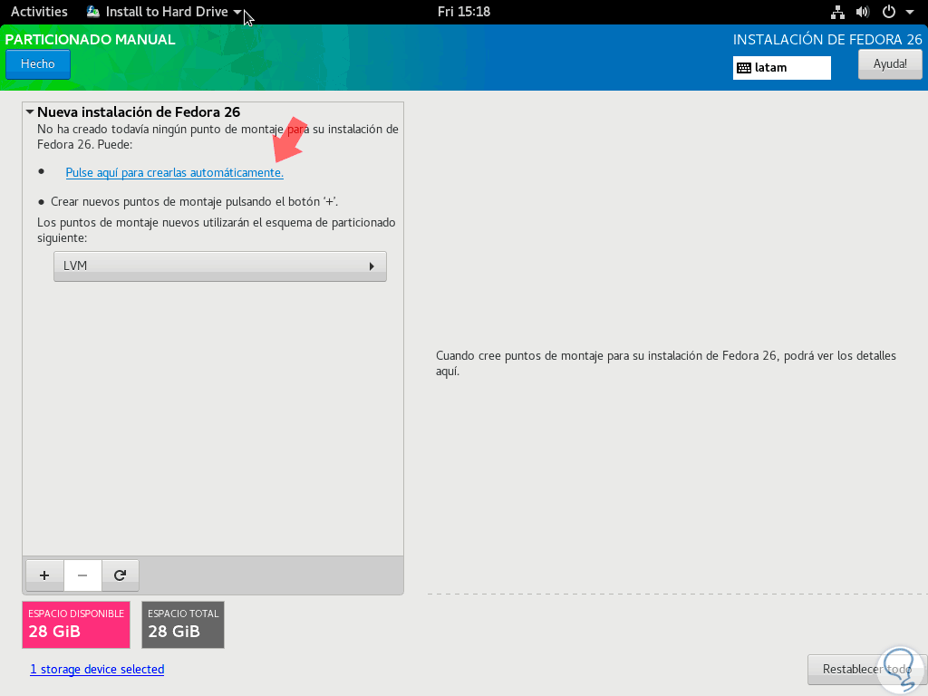 Aquí podemos ver el disco duro donde se instalará Fedora 26 y podemos añadir un nuevo disco y en el apartado de Configuración de almacenamiento podemos establecer la opción Automática para crear el directorio /home pero podemos personalizar estas opciones pulsando en la casilla Personalizada, luego pulsamos en el botón Hecho y será desplegada la siguiente ventana: