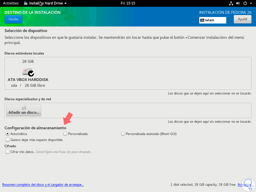 En este punto podemos configurar el idioma del teclado, la hora y fecha del sistema, la red a la cual se conectará y el nombre del equipo. Uno de los puntos más básicos es definir los valores del sistema que es donde y como se instalara Fedora 26, para esta configuración pulsamos en la ficha Destino de la instalación y veremos lo siguiente: