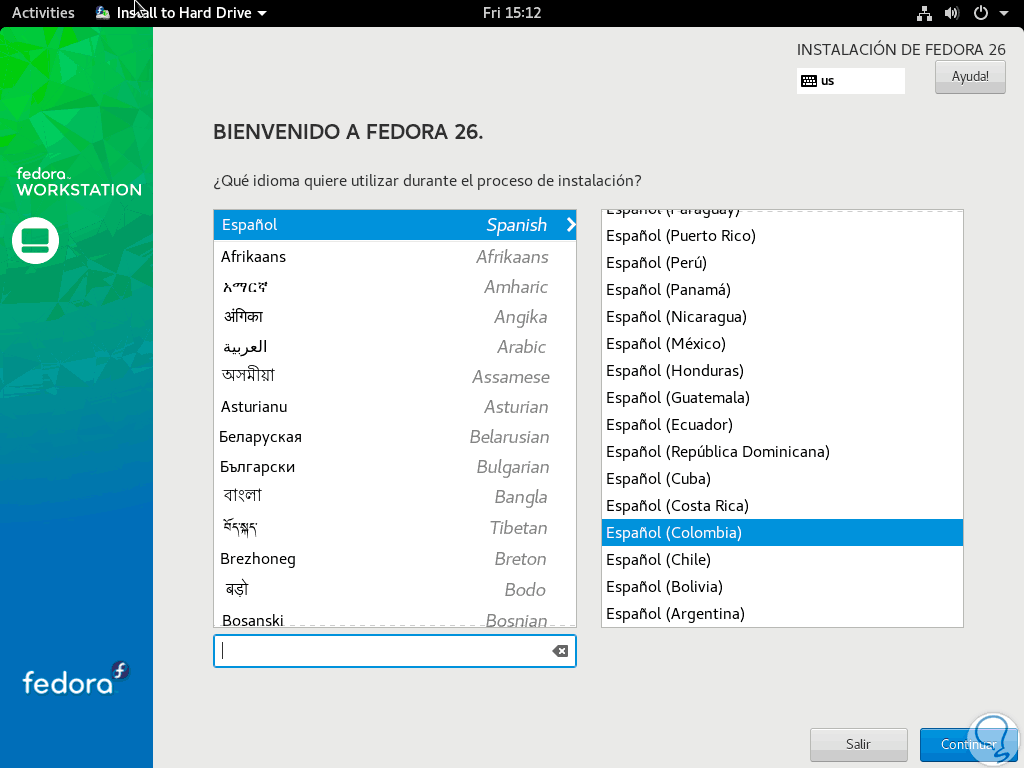 Allí tenemos la posibilidad de probar Fedora 26 sin instalarlo o bien instalarlo directamente en el disco duro. Seleccionamos la opción Install to Hard Drive y a continuación seleccionamos el lenguaje de instalación: