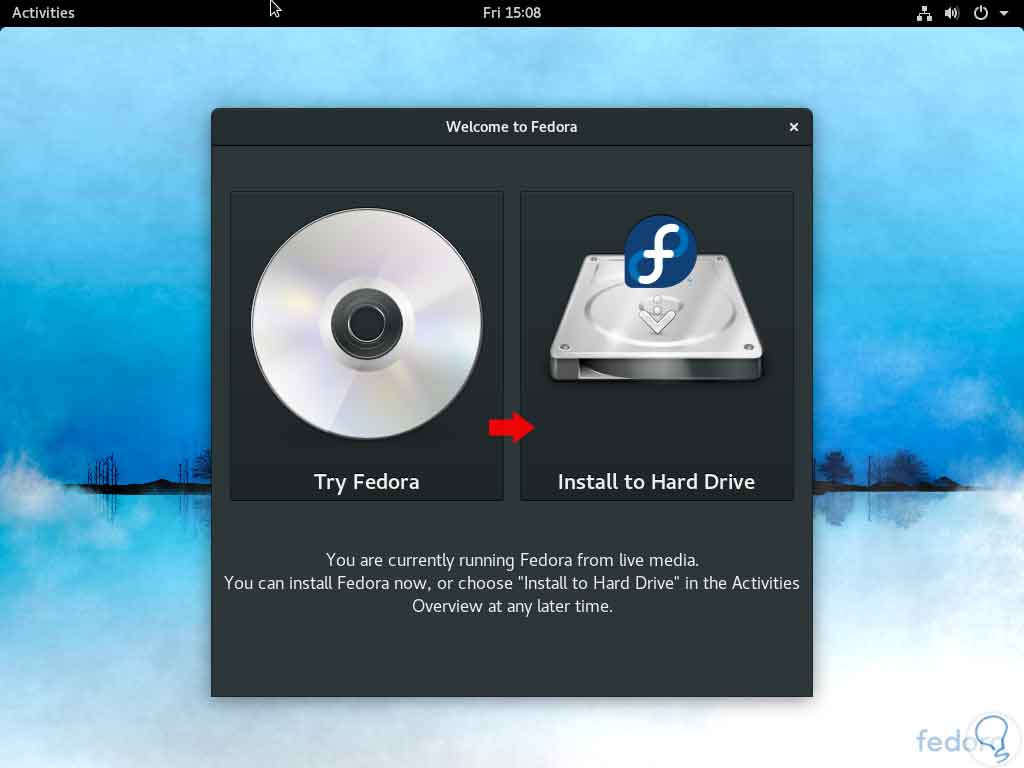 En caso de realizar una instalación limpia de Fedora debemos descargar la imagen ISO de alguno de los enlaces arriba indicados, grabar dicha imagen en un CD, DVD o en un dispositivo USB booteable y configurar el equipo para el arranque desde allí y el proceso constara de los siguientes pasos.