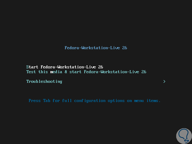 Al iniciar el equipo con la ISO de Fedora 26, en este caso usaremos la edición Workstation veremos las siguientes opciones: