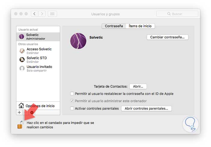 Pulsamos en la opción Usuarios y grupos y en la ventana desplegada debemos pulsar en el icono de candado para poder realizar cambios en las cuentas.
