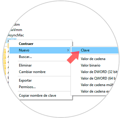 Allí crearemos una clave bajo atapi dando clic derecho allí y seleccionando la opción Nuevo / Clave: