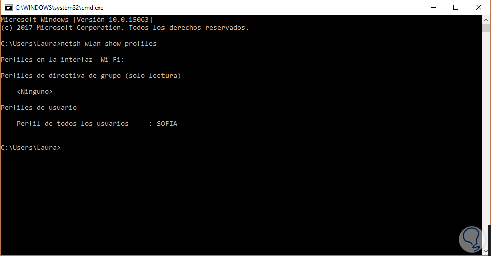 Para visualizar el o los perfiles de red Wi-Fi almacenados en Windows 10 debemos usar el comando: