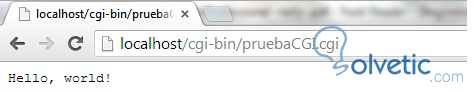 Como vemos nuestra primera línea contiene el SHEBANG requerido, luego debemos imprimir una cabecera para que el navegador sepa que debe hacer con el contenido, imprimimos una línea vacía para finalizar la cabecera y por ultimo imprimimos la clásica línea Hello, World! Si todo va bien solo deberíamos ver el Hello, World!; como lo que queremos es generar resultados Web vamos a cambiar la cabecera por lo siguiente para que el navegador lo interprete como un documento HTML