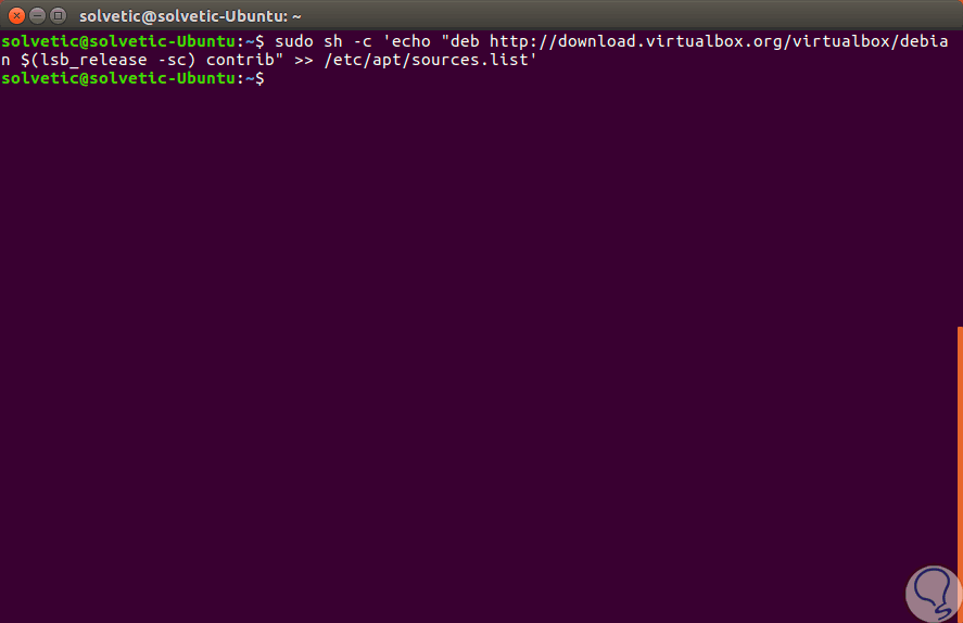 sudo sh -c 'echo "deb http://download.virtualbox.org/virtualbox/debian $(lsb_release -sc) contrib" >> /etc/apt/sources.list'