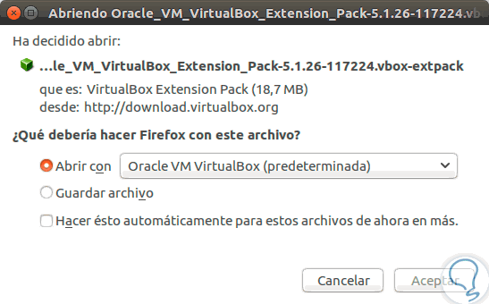 Para esto iremos al siguiente enlace. Allí pulsamos sobre la línea All supported platforms en la sección VirtualBox 5.1.26 VirtualBox Extension Pack.