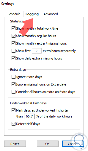 Allí vemos en resumen las horas productivas por día. En la pestaña Logging podremos definir los parámetros a usar para las estadísticas: