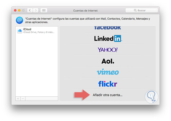 Allí pulsamos en la opción Cuentas de Internet y en la ventana desplegada vamos al final de las opciones donde seleccionaremos la opción Añadir otra cuenta ubicada al final de la sección: