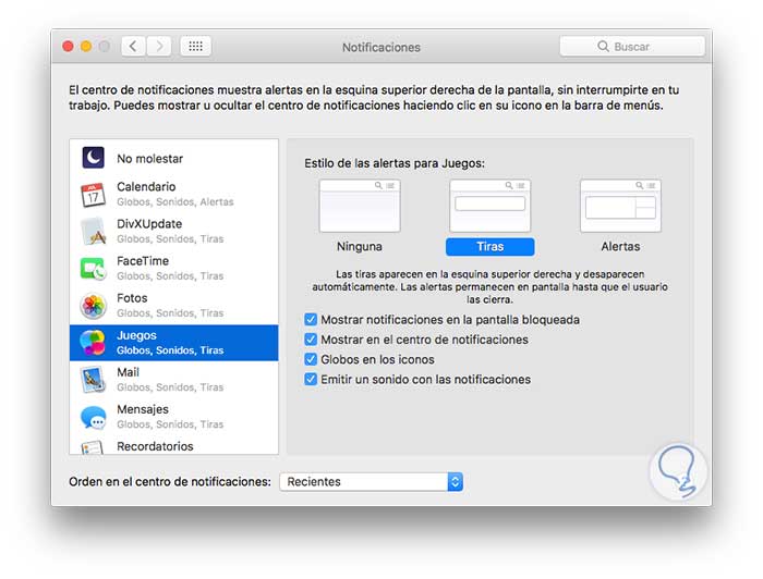 Pulsamos en la opción Notificaciones y en la ventana desplegada veremos la opción Juegos añadida: