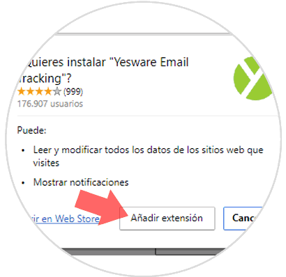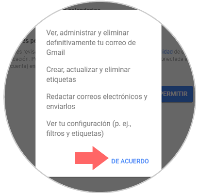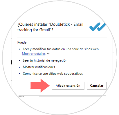 La siguiente ventana es para informarnos de las acciones y a que lugares de nuestra cuenta va a tener acceso la extensión, tales como consultar y administrar tu correo o administrar tus contactos. Pulsamos Aceptar