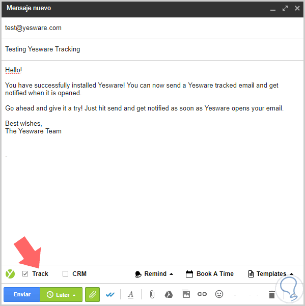 Ahora con la extensión instalada, tenemos que seleccionar redactar, para escribir un nuevo correo. Podemos observar en la parte inferior del correo el símbolo de Yesware. Tenemos que fijarnos que la ventana de Track esta seleccionada. De este modo estaremos indicando que queremos obtener información sobre ese mensaje.
