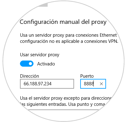 En la ventana desplegada activaremos el interruptor Usar servidor proxy ubicado en el campo Configuración manual del proxy e ingresaremos lo siguiente: