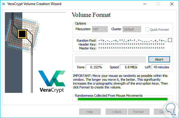 Dejamos la opción activa y pulsamos en "Next" e iniciará el proceso de formato de la unidad USB. Recordar que es bueno mover el ratón de un lado a otro dentro de esa ventana, esto es para generar un random con aumento de seguridad criptográfico de la key que estamos generando. Veréis la barra de abajo como va creciendo en función de la cantidad de movimiento que realicemos.