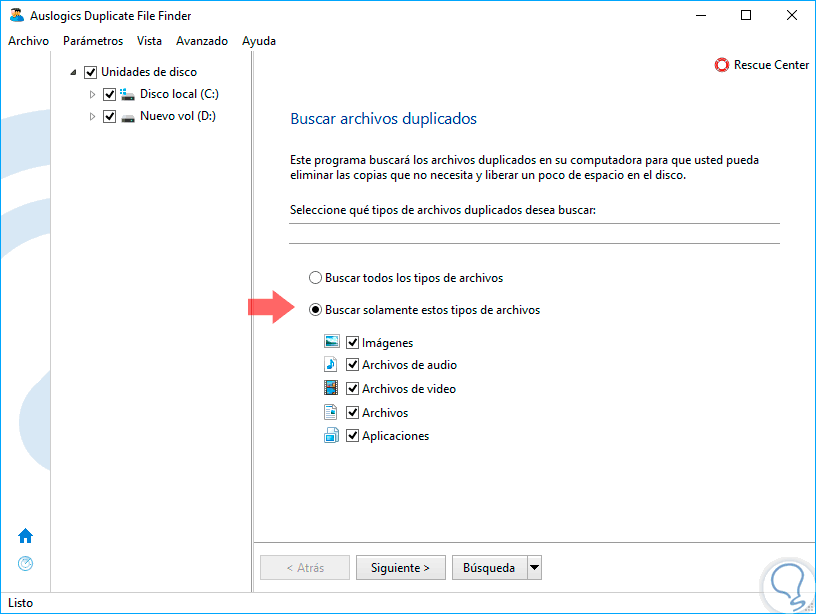 Allí podemos definir los tipos de archivo a buscar. Una vez definamos los respectivos valores pulsamos en Buscar para iniciar la respectiva búsqueda.