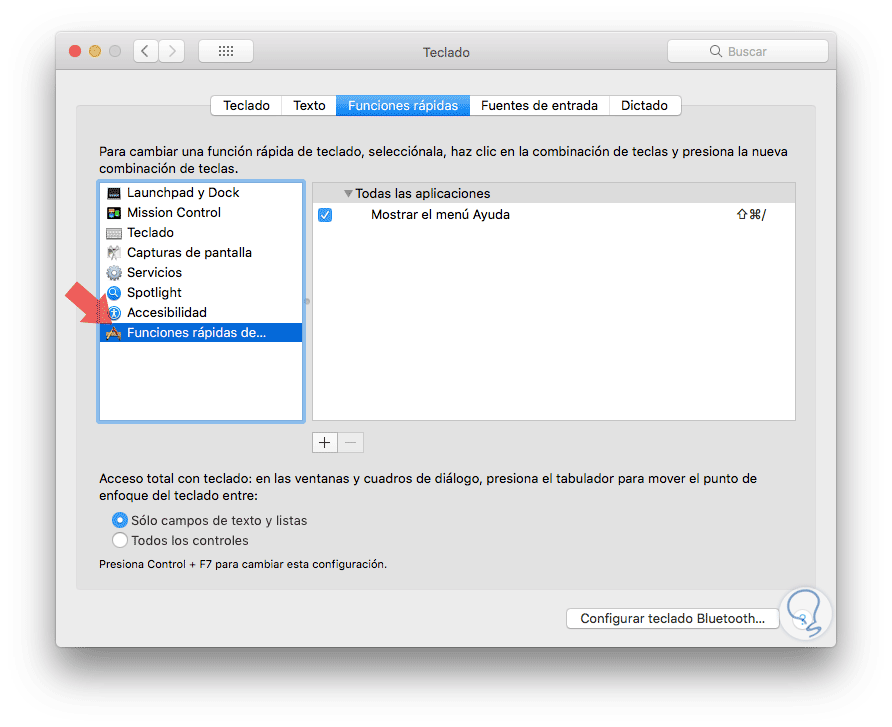 En la ventana que será desplegada vamos a la pestaña Funciones rápidas. Seleccionaremos la línea Funciones rápidas de teclado ubicada en el costado izquierdo: