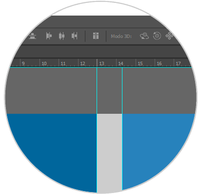 Crearemos las guías centrales del Lomo para que queden definidas ambas caras de la carátula. Para crear las guías pulsamos sobre la regla superior y lo colocamos en la medida que hemos indicado anteriormente. Para ello restamos el valor total de la Anchura (3224 píxeles o 27, 3 cm) menos la anchura del lomo (154 píxeles o 1,30 cm). Tenemos un resultado de 26 por lo que sabemos que ambas caras deben medir 13 cm. Colocamos la primera guía superior en el número 13 y la siguiente guía en 14,3 ( anchura del lomo). Esto se aplicaría a cualquier tipo de carátula incluido el folleto interior de DVD.