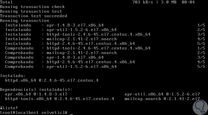 Para instalar Apache en CentOS 7 ejecutaremos la siguiente línea: