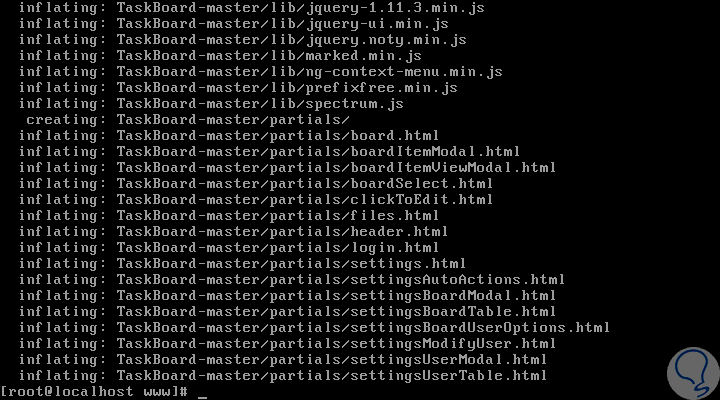 El comando anterior se encarga de extraer el archivo al directorio maestro TaskBoard. Modificaremos el nombre del directorio ejecutando la siguiente línea: