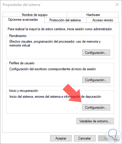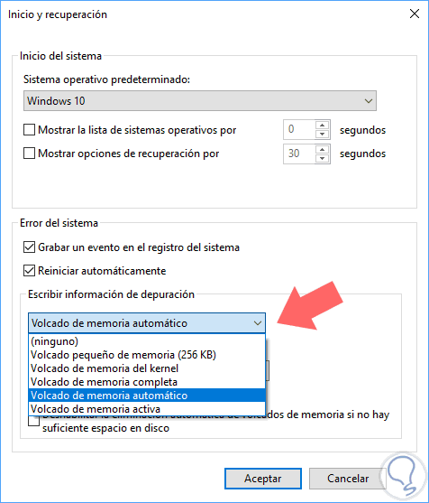 Pulsamos en el botón "Configuración" ubicado en la sección "Inicio y recuperación", ahora en la ventana desplegada seleccionaremos el tipo de volcado a asignar en el campo "Escribir información de depuración":