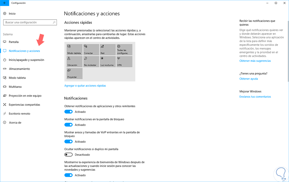 Allí pulsamos en la opción Sistema y en la ventana desplegada vamos a la línea “Notificaciones y acciones”: