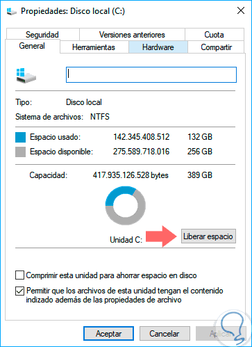 • Ir al explorador de archivos, dar clic derecho sobre la unidad C, elegir la opción “Propiedades” y allí pulsar sobre el botón Liberar espacio ubicado en la ficha “General”: