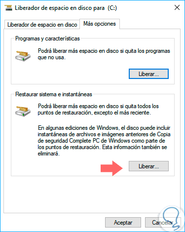 Para esto debemos acceder a la función Liberador de espacio en disco usando alguna de las siguientes opciones: