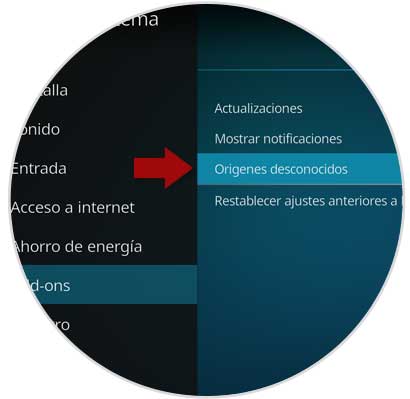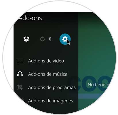 Para esto primero debemos habilitar los complementos de origen desconocido y para esto en la ventana principal pulsamos en Add-ons y en la ventana desplegada de Add-ons pulsaremos sobre el icono de piñón ubicado en la parte superior: