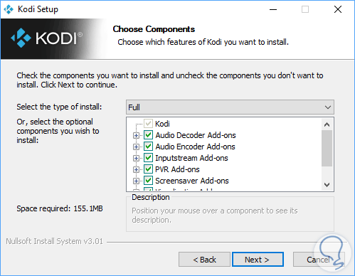 En la siguiente ventana debemos seleccionar la opción Full en el campo Select the type of install ya que de este modo serán instalados todos los complementos de Kodi: