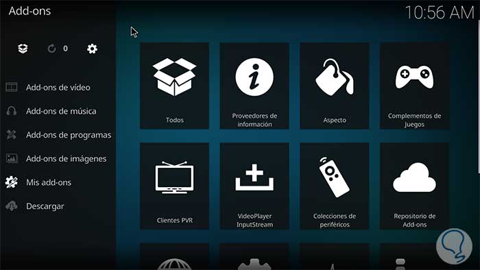 La apariencia de Kodi es una de las opciones que más podemos configurar según nuestro gusto. Para esto vamos nuevamente a Add-ons y seleccionamos la línea Descargar: