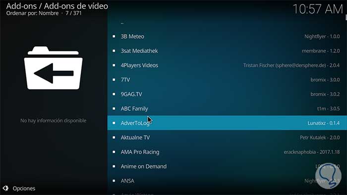 Podemos ver que no contamos aun con ningún complemento disponible, pulsamos en el botón Entrar en el navegador de add-ons y veremos todas las opciones disponibles. Allí daremos clic sobre el complemento deseado y será desplegada la siguiente ventana. Podemos ver la descripción del complemento y pulsamos en el botón Instalar para agregar dicho complemento a Kodi.