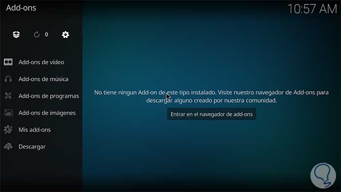 Para agregar un nuevo complemento en Kodi pulsamos en la opción Add-ons en la ventana principal: