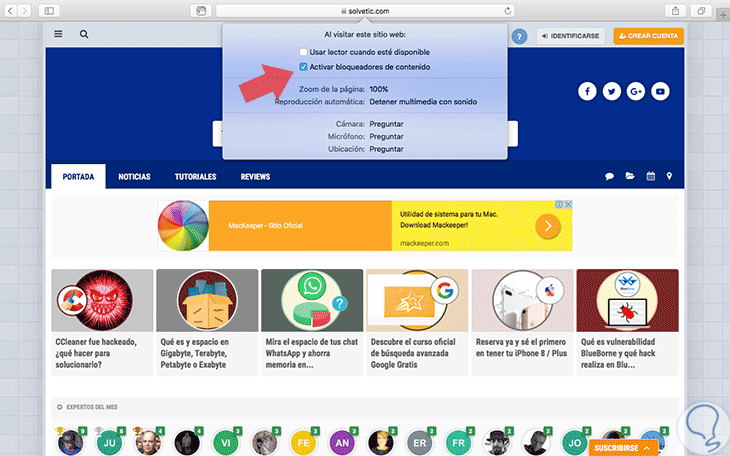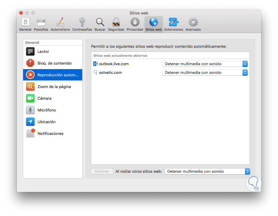 Para esto debemos ir al menú Safari / "Preferencias" y allí ir a la pestaña Sitio web donde veremos lo siguiente: