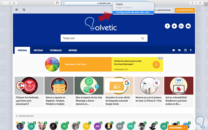 Para configurar esta opción iremos al sitio web deseado, y daremos clic derecho, ([color=rgb(51,51,51)]⌃[/color] + clic) en la barra de dirección y veremos lo siguiente, Allí pulsamos en la opción "Configuración de este sitio web"