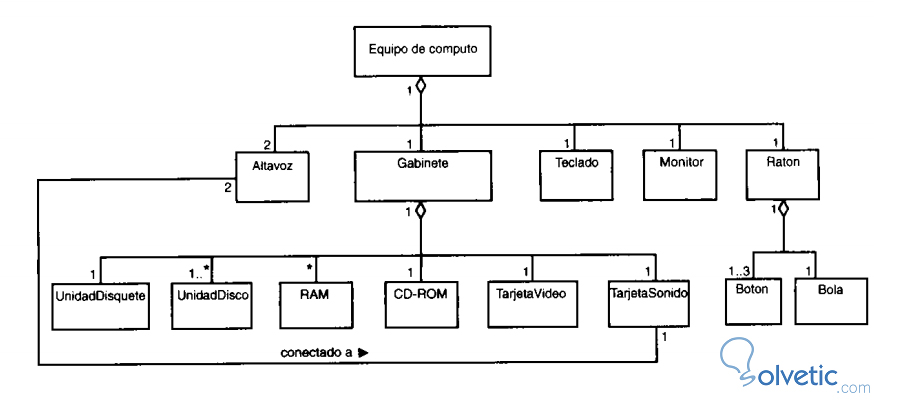 En este caso vemos la jerarquía de los elementos, en un todo tenemos al equipo de computo, de ahí sale un rombo y a través de una línea unimos los elementos, a su vez de gabinete sale un nuevo rombo y también de ratón, luego de estos tenemos respectivamente una línea que une a los siguientes elementos en el orden jerárquico.