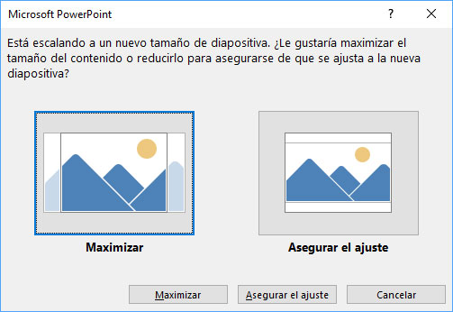 En caso de que PowerPoint no pueda escalar la diapositiva en alguno de los radios seleccionados nos mostrara las siguientes opciones. Allí seleccionaremos la opción más adecuada.