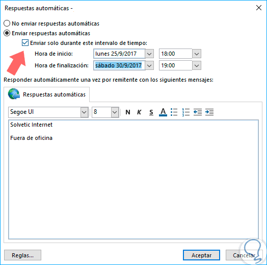 Si deseamos establecer un periodo de tiempo para el envío de la respuesta, activaremos la casilla “Enviar solo respuestas automáticas durante este periodo de tiempo” y asignaremos el rango deseado.
