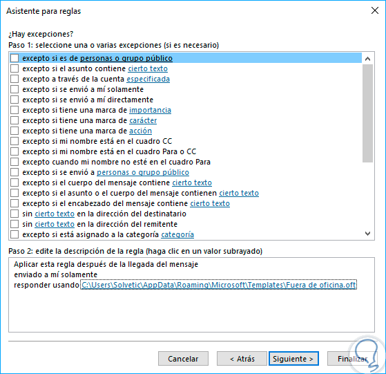 Pulsamos en Siguiente y a continuación podremos añadir excepciones si las deseamos, a dicha regla: